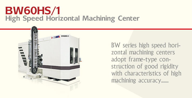 BW series high speed horizontal machining centers adopt frame-type construction of good rigidity with characteristics of high machining accuracy, good dynamic performance, high speed and fast tool changing etc. X, Y and Z-axis, connected with main frame directly and driven by adoption of linear roller cylinder guiding system and AC servomotor, can obtain rapid speed of 60m/min and accelerate speed of 10m/s2. The spindle is of high speed motor spindle with max. rotation speed of 16000r/min. The round type tool magazine, driven by AC servomotor, can accomplish auto tool changing action within 3.5 sec. Machines of this series are featured with high accuracy, high speed and high efficiency.